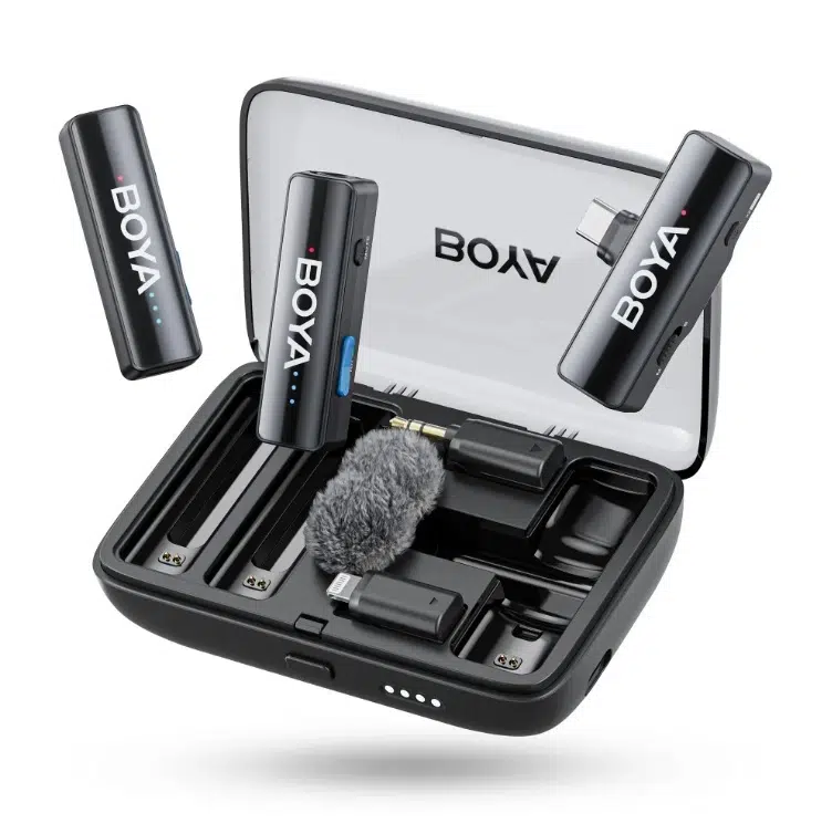 - Le microphone sans fil BOYA offre des solutions audio polyvalentes avec une portée de 300 mètres.